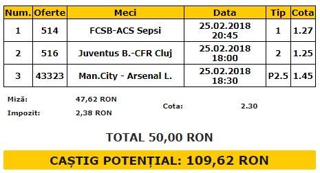 Biletul Zilei 25.02.2018. Pentru duminică ți-am pregătit un tichet format din trei meciuri, cu o cotă combinată de 2.30. Vorbim despre FCSB – Sepsi, Juventus București – CFR Cluj și Manchester City – Arsenal.