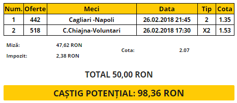 Biletul Zilei 26.02.2018. Pentru luni ţi-am pregătit un bilet cu o cotă de 2.07. Cele două meciuri selectate sunt Cagliari – Napoli, din etapa a 26-a din Serie A, respectiv Concordia – Voluntari, din ultima etapă a sezonului regulat din Liga I.