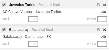Biletul Zilei 27.01.2018. Avem doua meciuri pregatite pentru tichetul zilei de sambata. Juventus Torino se deplaseaza la Verona, pentru meciul cu Chievo, programat la ora 21:45. Celalalt meci se disputa in Turcia, acolo unde Galatasaray primeste vizita formatiei Osmanlispor, de la ora 18:00.