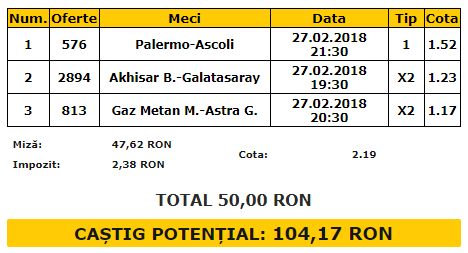 Biletul Zilei 27.02.2018. Pentru marți ți-am pregătit un bilet din trei meciuri, cu o cotă cumulată de 2.19. Este vorba despre Palermo – Ascoli, Akhisar Beledyiespor – Galatasaray și Gaz Metan – Astra.