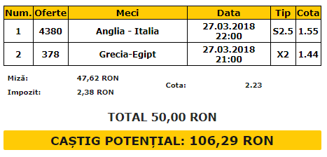 Biletul zilei 27.03.2018. Biletul zilei de marți este alcătuit din două meciuri amicale. Pariem pe numărul de goluri la Anglia – Italia și pe un meci bun făcut de Egipt în Grecia. Cota acestui bilet este de 2.23.