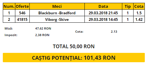 Biletul Zilei 29.03.2018. Ți-am selectat două meciuri pentru biletul zilei de joi. Vorbim despre Blackburn – Bradford , din Ligue One, și despre Viborg – Skive, din liga a doua daneză.