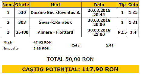 Biletul Zilei 30.03.2018. Pentru vineri ți-am pregătit un bilet format din trei meciuri, cu o cotă combinată de 2.48. Vorbim despre Dinamo – Juventus, Sivaspor – Karabukspor și Almere – Fortuna Sittard.