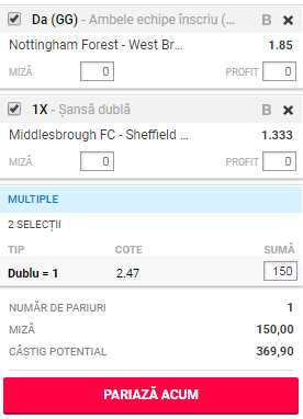- Pariază până la 250 de lei fără risc pe acest bilet. Spre exemplu. Dacă depui 50 de lei și biletul nostru cade, primești banii înapoi imediat!