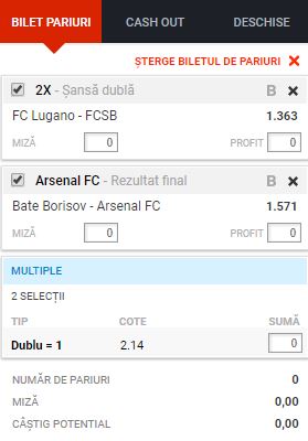 Biletul zilei din Liga Europa de joi este format din doua meciuri: FC Lugano – FCSB si BATE Borisov – Arsenal. Cota totala a celor doua evenimente este una de buna, de 2,14.