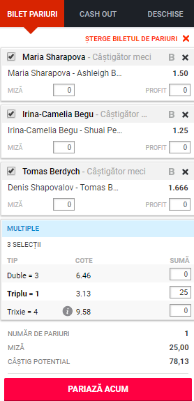 - Șarapova are o cotă bună să câștige partida cu Barty (1,50). Sigur, sunt șanse mari să întâmpine probleme, din acest motiv îți recomandăm și un pariu pe ”over” la gameruri.