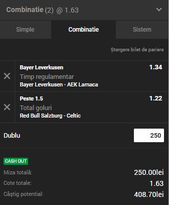Biletul Zilei Unibet 04.10.2018 are în componenţă două pronosticuri pariuri din Europa League. Bayer Leverkusen – AEK Larnaca şi Red Bull Salzburg – Celtic sunt meciurile pe care pariem. Cota totală este de 1.63! Biletul Zilei de ieri a fost CÂŞTIGĂTOR.