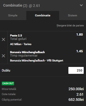 Biletul Zilei Unibet 09.12.2018 are în componenţă două ponturi pariuri. Meciurile pe care mizez sunt AC Milan – Torino şi Borussia Mönchengladbach – VfB Stuttgart. Cota totală este de 2,61!