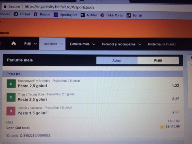 Din acest motiv, omul nostru a mizat ca vom vedea minimum doua goluri. A existat doar unul, intrucat Getafe s-a impus cu scorul de 1-0. Vazand ca treaba se impute, pariorul a asteptat sa se termine celelalte doua meciuri, apoi a selectat optiunea cash-out, care iti permite sa retragi o anumita suma de bani, mult mai mica decat castigul total, inainte de sfarsitul evenimentelor. Daca ii iesea si meciul Valenciei, ar fi castigat 4.400 de euro, ceea ce inseamna 20.204 lei, o suma excelenta, mai ales acum, de sarbatori… Faptul ca a dat cash-out, i-a adus un castig de numai 1.110 de euro, asta inseamna un profit de 310 euro. Nu-i rau nici asa!