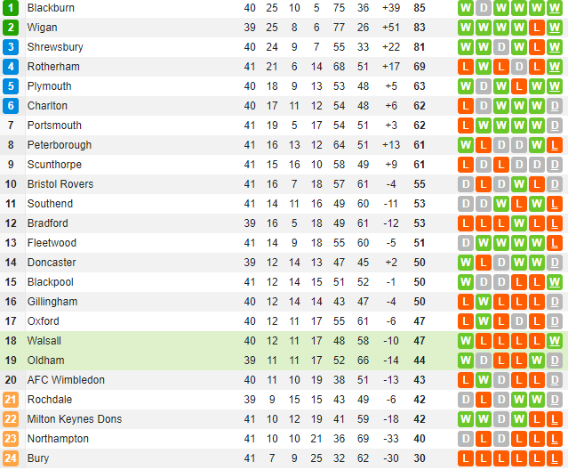 Oldham este pe locul 19 la doar două puncte de primul loc retrogradabil, în vreme ce Walsall este pe 18, la 3 puncte dinstanță de adversara sa de miercuri.