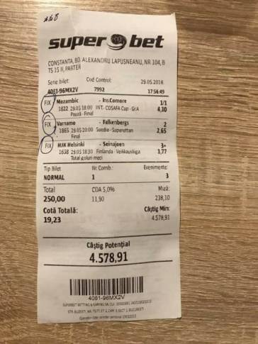 Cea mai mare cotă de pe cele două bilete i-a generat-o partida Mozambic – Insulele Comore. Aici a jucat pe ”1 pauză/1 final” și a prins un multiplicator de 4,10.