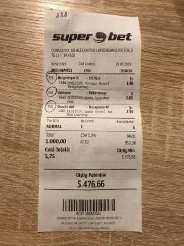 Pariorul nostru a reușit să câștige ultimele două bilete de pe urmă unor meciuri modeste. E oarecum normal, întrucât oferta este foarte sărăcăcioasă în această perioadă a anului. A jucat pe meciuri din Finalanda, Norvegia, Suedia și chiar pe meciuri din Africa. Fă-ți și tu propriul cont ONLINE și încasează 300 RON BONUS fără condiții de rulaj, AICI, la eFortuna. Primul pariu este GRATUIT. Dacă pierzi, întreaga sumă pariată de tine se va întoarce în contul tău și îi poți retrage imediat pe cardul tău! ACCESEAZĂ AICI LINK-UL PROMOȚIONAL!